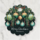 Elegant Christmas holiday round scalloped edge party favor tags feature pine branches, green and gold Christmas ball ornaments and ribbons on a black background with your details in chic lettering, perfect for your festive holiday gathering or for your gift-giving. MATCHING items in our collection.