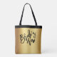 This elegant personalized typography wedding tote bag for the wedding party features a simple calligraphy design of modern black script that reads "Bride's crew" on a faux gold background with a top border of black. Designed by Susan Coffey.