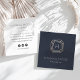 Promote your jewelry design business with these elegant square business cards in rich navy blue with golden accents. Design features an art deco style faceted gemstone illustration in faux gold foil, with a single initial monogram inside and two lines of custom text beneath. Add your jeweler business contact details to the reverse side, along with your social media username. To reveal additional social media icon options, open the design tool.