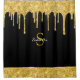 Enjoy this elegant shower curtain design featuring your name and monogram or initial with chic and sparkly gold glitter drips and border over a black background.