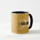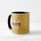 Chic gold glitter mug with a black typography name and a white script monogram. Personalize with name and initial.