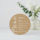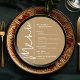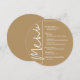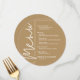A round gold dinner menu card features your menu choices in chic white lettering, perfect for a modern wedding reception, wedding rehearsal dinner, anniversary party or any special event with a sit-down dinner. Easily personalize with your dinner choices and details. MORE colors in our store.