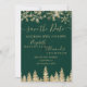 Time to celebrate your winter wonderland wedding theme with this luxury yellow gold glitter snowflakes sparkles and chic gold glitter pine tree forest on an elegant festive dark green background, featuring a modern cool script font typography. A chic and elegant wedding save the date card.
