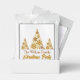 A chic gold script Christmas party drink mix packets with your family name under beautiful trees made of golden snowflakes above Merry Christmas. Trendy holiday favors with an artistic design.