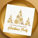 A chic gold script Christmas party paper napkin with your family name under beautiful trees made of golden snowflakes above Merry Christmas. Trendy holiday decor with an artistic design.