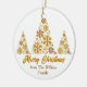 A chic gold script Christmas ornament gift with your family name under beautiful trees made of golden snowflakes above Merry Christmas. Trendy holiday ornaments with an artistic design.