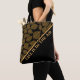 Weather fall is in the air or it is the warmth of summer, this tote can relay a special message. This design features a golden leaf skeleton pattern on the diagonal over black and solid black on the other diagonal with custom text on both sides. The back shares the reverse of the front design. Personalize the text fields on the front and back to give it a special meaning, remove text or use the edit design tool to select a font style, size or color you prefer.