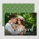 This chic, stylish "we eloped" wedding announcement card features your own wedding photo, plus white whimsical typography. Add your names and wedding date and location to the front. The back features a trendy moss green color with white polka dots.