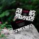 A chic hair stylist business card in black, white, and magenta with a silhouette pattern of hair stylist tools.