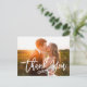 Stylish wedding thank you post card template featuring a photo on the front and back, "Thank You" in a modern white script font, and custom text thank you message.