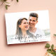 Chic engagement announcement featuring your photo overlayed with "happily ever after" in an elegant script with swashes and your names joined together with a heart. On the back, add two additional photos, customize your message and add your first names in a signature-like script.