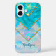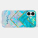 An elegant holographic girly blue iPhone 16 Case. This design creates a futuristic aesthetic with its layered, holographic geometric shapes. The abstract pattern reflects hues of aqua blue, pink and violet catching the light in dynamic ways to give the iPhone case a three-dimensional, high-tech look.