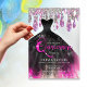 Elegant black hot pink dress crystal drips Quinceanera Acrylic transparent Invitations with faux glitter and rhinestones design and a pretty black dress with hot pink glittery patterned accents. To make it extra special you will personalize it with your own information with beautiful monogram fonts.