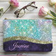 Chic iridescent purple blue faux glitter monogram personalized Accessory Pouch. It is designed with elegant girly silver and iridescent faux glitter in unicorn, rainbow, teal, aqua, turquoise and green.