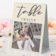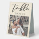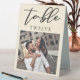 This simple elegant ivory wedding table number table tent sign features chic black typography above an engagement photo. Add your favorite romantic couple photographs for your tables.