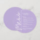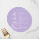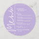 A round lavender dinner menu card features your menu choices in chic white lettering, perfect for a modern wedding reception, wedding rehearsal dinner, anniversary party or any special event with a sit-down dinner. Easily personalize with your dinner menu and details. MORE colors in our store.