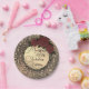 A glittery leopard print on a dusty rose pink backdrop with a gold circle in the middle where you can customize it which is adorned with an elegant gold flourish joined by three roses for added elegance. Chic glam vibes.