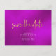 Chic and modern signature script in faux gold Save the Date postcards, iridescent magenta pink background. Copyright © 2016-2019 Bombino Designs.