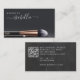 A chic modern minimalist makeup artist business card, featuring a white script typography on a charcoal gray black background, and makeup artists tools of the profession on a black background. QR code and social media on a charcoal black distressed background on the back of the card. A simple chic style.