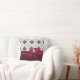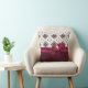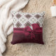 Lovely maroon damask throw pillow, with a maroon damask pattern, on the back and bottom front of the pillow, and a off white, with maroon and green pattern, on the top front. Elegant graphics of a burgundy satin look ribbon separates the two backgrounds patterns. Pretty addition to any room and makes a great gift idea.