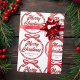 Chic, modern cursive script across a gorgeous red ribbon and bow reads MERRY CHRISTMAS in elegant cursive typography. A tied bow is super trendy for 2025 non photo holiday wrapping paper. Personalize with your family or business name in the center of this gift wrap.