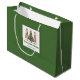 Minimalist watercolor christmas tree gift bag with playful leopard pattern in earthy green and gold. Personalize with your custom name for a stylish Christmas gift presentation.