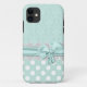 Lovely mint green and white iPhone 5 case, with a mint green on green damask pattern, on top, and a mint green with white polka dot pattern, on the bottom. Graphics of a white lace band and a mint green ribbon and bow runs across the middle between the two backgrounds. Customize to add your own text. Great way to look stylish and protect your electronic device at the same time.