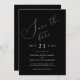 Elegant Modern Chic Black Wedding Save the Date. Gorgeous sophisticated designer wedding save the date with white text on black featuring striking pale gray Save the date script typography header. Personalize with your save the date details text. The back is solid black. All text, fonts, and colors are customizable, and can be added or deleted as you choose.. We invite you to visit our store, Austen & Grace, to view the full wedding suite, matching products and more. Please contact us if you require any assistance.
