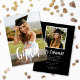 This graduation announcement features a full-frame photo and modern script "Grad" in white on the front. On the back there is another photo and invitation text for a graduation celebration.