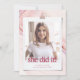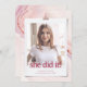 She Did it! Chic | Modern Typography Graduation Announcement. This stylish graduation announcement features a beautiful pink abstract watercolor background on a photo that is designed to look like a vintage snapshot while still being stylish for today's graduate.