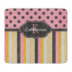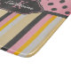 An elegant and girly monogram design featuring a striped background on the bottom in pink, yellow, black and porcelain white with a black polka dot pattern on pink at the top of the design. A scroll is featured in the middle with a chalkboard style background with customizable text for your monogram initial and name in coordinating pink and white. 15cps