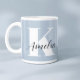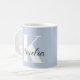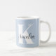 Personalized light blue mug featuring your monogram initial in modern large white typography and your name in a stylish signature script.