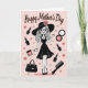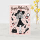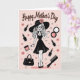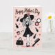 On the front of the card a stylized animated woman stands tall at center, smiling with an easy confidence that feels like a warm nod between close friends 👩. She wears a black sleeveless dress with a wide-brim hat topped by a soft pink flower, and oversized glasses that give her a chic, approachable look. Pearl-like jewelry circles her neck and wrist, and gold hoop earrings catch the eye, adding a gentle touch of romance in the way her pose seems to invite admiration ❤️. Near her feet sit a black handbag with gold accents and a pair of black heels, grounding the scene like she’s just stepped into a special day. The background is a blush-pink field sprinkled with floating beauty items—pink lipsticks, open blush compacts, and a slim black comb—drifting around her like a pampering day in motion. Small outline hearts and light floral shapes weave between the items, creating the feel of affectionate attention without needing extra words. Across the top, the phrase “Happy Mother’s Day” is placed in an arched line in dark lettering that stands out against the pale pink. Tiny heart outlines and blossom-like motifs are scattered around the upper area near the curved text.