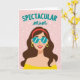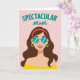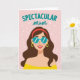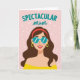Designed with a bright, modern illustration, this card features a stylized woman shown from the shoulders up, filling the lower two-thirds of the front. Her dark brown hair falls in soft waves around a fair face, and her wide smile with red lips and gently rosy cheeks gives her a friendly, affectionate look ❤️. Large round teal sunglasses with thin white reflective stripes sit high on her nose, adding a fun, flirty touch, and shiny gold hoop earrings frame her face. A red headband arcs across her hair, echoing the warm tone of her sunny yellow off-shoulder top, as if she’s dressed up for a sweet family moment. Across the upper area, the word “SPECTACULAR” appears in large teal uppercase letters, with “mum” placed just beneath it in a smaller, flowing teal style. The background is a soft pink field scattered with tiny lighter speckles that resemble confetti, giving the scene a gentle celebratory feel 🌼. The overall look uses flat color areas with minimal shading, and the pink backdrop is dotted evenly from edge to edge.