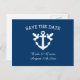 Chic nautical theme wedding save the date card. Elegant design with blue and white color palette. Great for reminding guests of your maritime weddings. Personalize with bride and groom name plus date. Classy boat anchor logo with heart and white doves.