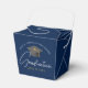 These modern navy blue custom senior graduation party fortune favor boxes features your high school or college name for the class of 2026. Customize with your graduating year under the chic handwritten script and grey grad cap for great personalized graduate party favors.