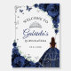 Navy blue, silver and white Quinceanera welcome foam board sign. Features brunette girl in ball gown dress, script font, silver butterflies, dark blue roses and tiara. Perfect for an elegant princess style glam celebration. Personalize with your own details.