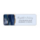 The left-hand edge of this elegant modern wedding invitation return address label features a navy blue watercolor agate border trimmed with faux gold glitter. The customizable text combines charcoal gray handwriting and copperplate fonts on a pale pastel blue background.