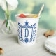 These chic pagoda monogram cups are perfect to use for entertaining and make an excellent hostess gift. The pagoda design and the monogram are in a navy blue on white.