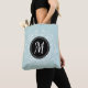 Stylish tote bag with personalized monogram with pale blue & white floral wreath design.