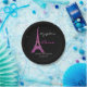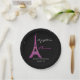 Glam Paris themed Sweet Sixteen birthday party paper plates, done in black, with graphics of a pink glitter looking Eiffel Tower and white twinkling stars. Personalize the custom white and pink text to read what you want. Matching napkins and invitations are available.
