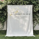 This chic and stylish wedding photo booth backdrop features a contemporary set of fonts and script elements in black, alongside delicate floral outlines in faux gold against a soft ivory background.