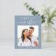 Budget-friendly all-in-one dusty blue wedding invitation featuring your photo, "Happily Ever After" in a mix of simple white typography and a chic white script with swashes, and your first names and your wedding date joined together by a heart. On the back, personalize your invitation in elegant white typography and input your wedding website address to create a QR code for your guests to scan to RSVP online and to obtain additional wedding details such as accommodations and directions. This budget semi-gloss paper is similar in weight to photo paper. Traditional heavier card stock versions are also available (message us for the link).