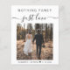 Budget-friendly elopement or private wedding announcement and casual reception invitation that features your photo and "Nothing Fancy Just Love" in simple typography and an elegant script with swashes. Under your photo, add your names and wedding or reception date. On the back, input your wedding website address to create a QR code for your guests to scan to RSVP online and obtain wedding details and add your names in a signature-like script. This budget semi-gloss paper is similar in weight to photo paper. A larger 5x7 traditional card stock version is also available (message us for the link).