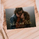 Chic save the date card featuring swirly text that says "save our date" in gold on top of your photo.