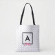 Chic monogram tote bag featuring a black bordered square with a pink ribbon against a black and white polka dot pattern.