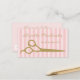 Remind clients of upcoming appointments wit these chic pink and gold hair and beauty salon appointment reminder business cards for the professional hairstylist with a pair of gold hair cutting scissors against a light pink vertical striped background. This design is perfect to advertise your skills as a professional hair stylist or beautician.