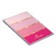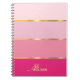 Organize your thoughts in style with this chic notebook, adorned with an array of pink stripes ranging from soft pastels to bold hues. Gold lines separate the colors, adding a touch of luxury to the design. Customize it with your name, monogram, or any text you like, or keep it simple by removing the sample text. This notebook combines fashion and functionality, making it a perfect accessory for your desk or a thoughtful gift.