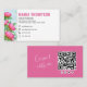 This Design features modern simple professional scannable, floral flower peony foliage greenery, QR code website social media, a modern trendy pink business, an office corporate trendy stylish design, a contemporary elegant minimalist design, a phone website cell email icon, clean sophisticated contemporary flower, a botanical leaves flourish chic
