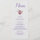 This wedding reception menu features a lovely purple floral wedding reception menu using this gorgeous, watercolor themed design. Featuring "Menu" written at the top using cursive purple font, all of your information is printed in purple readable font on a light purple background. Customize as you choose.